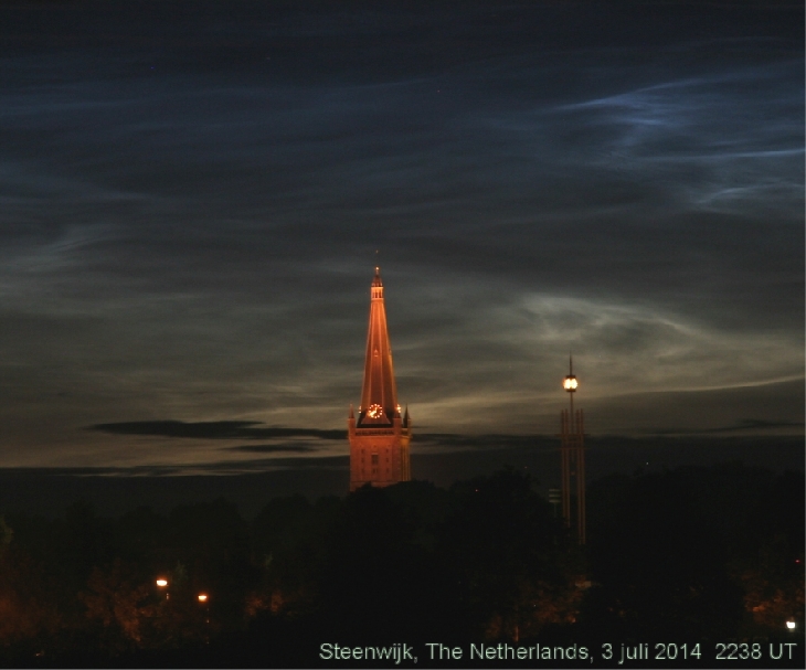 In transparent but partly cloudy skies my first NLC's of this season, initially the NLC reached Heights of 20 degrees above the northern horizon. That was easy enough for my 95 year old mother to watch the NLC from our home. Later from another location I was able to get them in combination with the old medieval tower of Steenwijk. It was a splendid display.