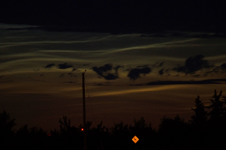 Well, it wasn't a mammoth display of NLC like the ones in Europe several hours earlier, but we'll take it! This NLC display sprang out of the northwest just after local midnight, around 0150 local time (0750 UT Jul 4), increasing rapidly in brightness, but staying only about a degree above the horizon. As dawn approached, more NLC could be seen to the north and northeast as foreground tropospheric cloud moved out of the way. Sony A65, 75-300mm, f/4.5-5.6, 2.5-8 second exposures with ISO 400.