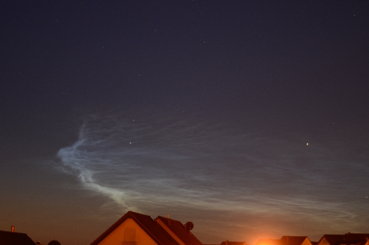 At my 50°N latitude NLCs usually are a horizon hugging affair. The display was not spectacular but nice to see - the cloud slowly drifting towards west and dissipating within an hour. 2242h UT,