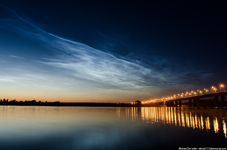 Bright noctilucent cloud was observed on the night of 7 July over most of European Russia. The brightness of some elements of NLC reached the maximum value. The clouds were moving in from the North-East to South-West, was observed at night and in the morning were visible in the center of the sky. Pictures made on the coast of the Volga, Yaroslavl, Russia.