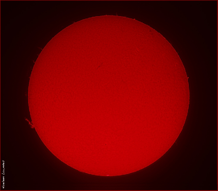 Image taken with a Lunt 80mm solar telescope and Canon 7D camera with a 2x Barlow lens. The image is a composite of two images one for the surface and one for the prominences.