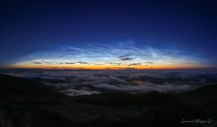 Ever night the haar has been rolling in of the North Sea across Aberdeenshire, so I decided to climb my local hill, Benachie, to get above the fog. It was well worth the effort, with yet another bright display of noctilucent clouds, which extended towards the southern horizon later in the increasing twilight. Shots taken with a Canon 6d between 2248 UTC and 0217 UTC.