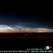 While traveling east from overhead Edmonton I was surprised to see no NLC, but by Churchill the sky was becoming alive with bright Noctilucent Clouds! Then the moon popped up, at first below the level horizon looking 2 degrees down from 37,000 feet. But soon the Moon was visible behind bright ripples of NLC. Amazing! Another patch of NLC was seen to our south perhaps over the Maritime Provinces??? Looking forward to any photos from there. More: www.SpaceClouds.info