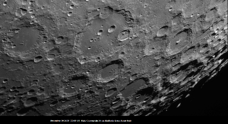 View of Highland craters on the Moon including the crater Clavius. Amazing view and good seeing. Note the saturation of craters. Saturation occurs when the impact-induced erosion and burial rate matches the creation rate, reaching an equilibrium density. Lunar highlands are heavily saturated, while younger maria (lava plains) are not.